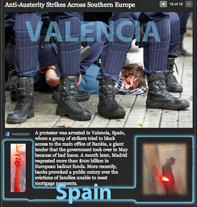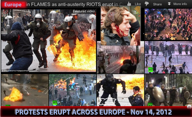 November 14, 2012 - Europe in Flames: Protests against bankers, governments erupt across Europe Cure Worse Than Disease With unemployment soaring, millions take to streets across Europe to protest central bankers' remedy for crisis management; globalists created it when they invented the infamous "euro"; Police mug teenage boy and girl in Spain; "euro" falling apart, as predicted before it was launched
