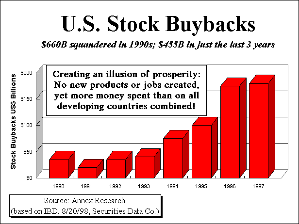 During the last three years alone, corporate America has spent nearly half a trillion dollars on Wall Street's virtual "cabbage patch" dolls - without creating a single new job or a product. Stock buybacks attracted more money in 1990-1997 than did the economies of all developing countries in the world - combined! (about $550 billion, according to a United Nations report - see Annex Bulletin 97-38, 10/16/97). "Sound Bites"... This week, stock buybacks shot back into the news headlines as the IBM board fingered another $3.5 billion for share repurchases, raising the cumulative capital authorized since early 1995 to $27.5 billion. Here are some "sound bites"...7 Bloomberg News Wire: "An Illusion of Prosperity." "Their (IBM's) fastest-growing business is services, and you don't have to build factories for that,'' an analyst at Brown Brothers Harriman & Co. in New York, who has a "short- term buy'' on IBM shares, told Bloomberg News Wire on Oct. 27. "You have to do something with the money.''"It's a waste of capital - it doesn't create a single product or a single job," this writer was quoted as saying in the same story. The comment was followed by a Bloomberg footnote that, "(Djurdjevic) has been a longtime critic of buyback programs at IBM and other companies." Bloomberg added, "in the third quarter, Djurdjevic estimates that IBM's share buyback increased its earnings per share by 11 cents. 'It creates an illusion of prosperity by boosting the financial results without adding a cent to the bottom line,' Djurdjevic said." The New York Times: "A Wall Street Perversion." Meanwhile, the New York Times quoted on Oct. 28 an analyst with Merrill Lynch & Co, as saying that, "I think it's a reasonable use of cash. How many investment opportunities do they have that can return cost of capital? They should be investing up to that point, and beyond that they should return cash to the shareholders.""But Bob Djurdjevic, president of Annex Research, called the repurchase a 'Wall Street perversion,' that benefits selling institutions to society's detriment, and artificially inflates current earnings and growth," the Times said. "IBM has already spent several small countries' GDPs on share repurchases - $23 billion and counting - without creating a single product or a single job," he said. "It's a signal they don't have the imagination or creativity to employ the capital more productively." Dow Jones Newswires: "Paying Off Wall Street." "They generate a substantial amount of cash flow, and earning interest (on the cash) just isn't a good solution," a Gruntal & Co. analyst told the Dow Jones Newswires on Oct. 27. "Buying back stock is just one weapon they use to enhance shareholder value."By contrast, the Dow Jones wire quoted "the publisher of the Annex Bulletin in Phoenix and frequent critic of IBM's buybacks," as saying that the program "demonstrates a lack of creativity." "They're saying they can't think of a better way to invest in the (technology) industry," Djurdjevic said, adding that he is opposed to stock buybacks in general. "Instead they are paying off Wall Street (in exchange for) good opinions of IBM's stock." Why Buybacks Are a Scam So there you have it: a real conundrum, it would seem. Actually it is not. It is a scam. And here is how it works...Let's suppose a CEO of a large publicly-traded company happens to be voted into office thanks to support from the large, publicly-traded Wall Street institutions. Let's suppose he does well, and turns a moribund company around. Then the time comes for him to pay back his sponsors. So what does he do? Increase the dividends? Nah... of course, not. That way ALL shareholders, not just Wall Street institutions, would benefit from it. Instead, the CEO and his Wall Street cronies cook up a scheme called stock buybacks. The CEO's company repurchases (tens of) billions of dollars of its shares, mostly from the Wall Street institutions, of course, which account for a giant share of the trading volume, compared to the "Ma and Pa" investors. By a miraculous coincidence, most "respected" Wall Street analysts start hailing the CEO's stock as the greatest thing since sliced bread. (Some examples of such a hype were shown in the "Sound Bites" section of this Annex Bulletin). So the "Ma and Pa" investors (as well as some uninitiated institutional players) pump billions of additional dollars into the CEO's company stock, pushing up its market value to record levels. Now, from a hypothetical to a real world example... In IBM's case, despite its mediocre fundamentals, and a recent warning by its CFO to analysts NOT to increase their profit estimates for 1998 (see Annex Bulletin 98-36, 10/20/98), the Big Blue's stock kept setting all-time highs nearly every day of this week. Unperturbed by this dichotomy, Wall Street analysts continued to trip over each other to recommend this grossly overpriced stock to their investors as a "buy." Which leads to a fairly obvious question: Are they stupid or bought? (We'll let you decide on that). The Washington Scam By the way, American taxpayers could also be asking the same question about the Washington politicians: Are they stupid or bought? For, just as our above hypothetical CEO took the money from IBM's general shareholders so as to share it with his Wall Street cronies, so do many of our politicians. They take our votes and our money to bail out Wall Street bankers.Think the $40 billion-Mexico bailout; the $140 billion-and-counting Southeast Asia bailout; the $20 billion-Russia bailout; the upcoming $30 billion Brazil bailout... (see "Wall Street, Not Mexico Bailout," Annex Bulletin 95-08, 2/02/95). Put it all together, and what we're seeing is the birth of new global taxation system; the new "socialism international" whose main beneficiaries are the Wall Street "vulture capitalists," and the main victims western taxpayers. Worst of all, it's a new form of "taxation without representation." In fact, even the corporate shareholde