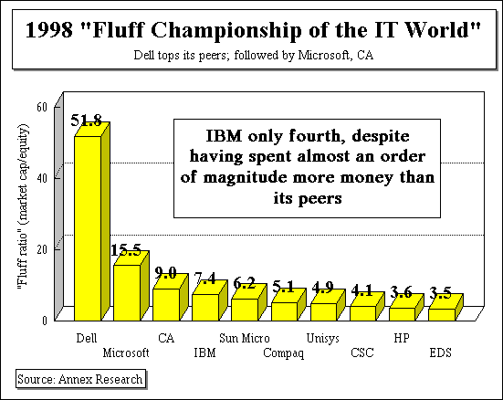 A "barbie doll" scam? What's that? It's the flip side of the "cabbage patch" fad. In fact, it is a complement to it. The "barbie doll" scam is the insider trading. At the same time as a company (IBM, for example) is BUYING back its shares, the insiders who are running it (!) are SELLING! In other words, it's financial incest. This week, for example, IBM's CEO sold 142,000 shares for a gain of about $16.6 million. Five months ago, Gerstner flipped another 138,000 shares for a $14 million profit. It should come as no surprise, therefore, that scores of IBM CEO's lieutenants followed their boss' lead down the path of greed. Of all IBM insider trades reported by Vickers Stock Research Corp. during the first half of 1998, 94% of the IBM insiders SOLD their shares. And that number is likely to go up when the third and fourth quarter insider trades are reported, as evident from Gerstner's last sale. Debunking Some Myths Defenders of the stock buyback scheme tend to cite three arguments in support of it. All are myths.Myth #1: Proof of management confidence. The first myth is that it is the proof of the company management's confidence in the value of its own stock. This week, a CNN financial reporter, for example, said as much as he read the news about the latest round of IBM buybacks. And he said it with a perfectly straight face. The reason we found such gullibility hard to believe is because it fails the "Logic 101" test. As you saw above, many senior IBM executives, including its CEO, took advantage of their own hype to SELL their stock options. And that's confidence? To be sure, any amount of buying, especially in the billions of dollars, does tend to push a stock up. Any stock. But that's an artificial boost; a scam just as if a home owner were to bid against other bona fide arms-length buyers to prop up the value of his own house. In other words, it's creating an illusion of prosperity. Furthermore, despite all the hype which the stock buyback fad has received, only about 20% of the publicly traded enterprises have exercised stock buyback programs. But since they are the 'household name' companies, like IBM, or GM, or Texaco, one gets the impression that the practice is more widely spread. Now, let's apply "Logic 101" again. If buying back one's shares were indeed a sign of management confidence, what are we supposed to believe, that conversely, executives in 80% of corporate America don't see the value in their companies? Of course, it doesn't mean that. It means that four-fifths of corporate America is still minding its business, rather than allowing itself to be distracted by the Wall Street buzz. Myth #2: Best use of cash. Another self-serving stockmarket myth is that Wall Street knows best how to invest your money. Such a theme was discernible from the various analysts' comments in the "Sound Bites" section of this Bulletin. Maybe it does. Or maybe does not. One thing is for sure, though: Every time your funds are funneled through Wall Street, the bankers take a cut. Which tends to undercut their objectivity in making such self-serving statements. Nevertheless, this myth is clearly selling well. As you saw in the Annex Bulletin 98-31 (8/13/98), the Wall Street's institutional holdings have soared from the 7% share of the total U.S. equities in 1950, to 48% in 1997, according to the New York Stock Exchange (NYSE) Fact Book 1997. During the same time frame, the share of the stockmarket equity held by the U.S. (Main Street) "households" has declined from 90% to 44%, despite a 8% compound annual growth between 1950 and 1997. As a result, the U.S. stockmarket equities broke the bank by the end of 1997, the global financial crises notwithstanding. They reached a record, $13 trillion level. Just to put things in perspective - that's 1.6 times the U.S. GDP. Back in 1950, their corresponding share was only 48% of the U.S. GDP, with the institutions accounting for a mere 3% of the economy. The result has been a loss of market power for Main Street, and a surge of it for Wall Street. As in any casino, it takes a sucker to enrich the "house" through the gambler's greed or gullibility. Myth #3: A variation on "best use of cash." "When a company repurchases shares on the open market it reduces the available pool of shares in the overall market," an industry analyst wrote to us this week in defense of the stock buybacks. "The capital is then freed up to invest elsewhere." Sure. IBM shareholders' capital is being "freed" to be invested by SOMEONE ELSE! So this is merely a variation of the Myth #2. Once again there is an underlying assumption that "Wall Street knows best" how to spend your money for you. As you saw earlier, about 80% of corporate America disagrees with that notion. The IT "Fluff" Championship Even closer to home, in the IT industry, stock buybacks are far from prevalent. We have just finished an analysis of 10 IT leaders from the various segments of the industry. Three are conglomerates (IBM, HP, Unisys); two are IT services vendors (EDS, CSC); two are software companies (Microsoft and Computer Associates); two are PC makers (Compaq and Dell); and one is a midrange systems provider (Sun Microsystems). Our objective was to determine which ones of these 10 companies have the greatest amount of "fluff" in their stock prices (i.e., market hype, or hot air - if you prefer).So we dubbed the whole exercise the "Fluff Championship of the IT World." And, of course, we used our "fluff ratio" (market cap over equity), among other financial indicators, to try to figure who the champ is. And the winner is... IBM? No. Hewlett-Packard? No. You're getting colder. CA? No. But now you're getting warmer. Microsoft? No. But warmer; almost there. Compaq? No. Now you're getting colder again. Well, who then? Dell! This Texas-based PC maker is the 1998 "fluff" champion of the IT world. Dell's "fluff ratio" was 51.8, meaning 98% of its $83 billion market cap was made up of "fluff," versus only $1.6 billion o