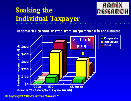 But perhaps the greatest income tax scam was how the FDR (Roosevelt-Democratic) administration and Big Business used World War II to push through a "temporary" wartime emergency legislation. It was a law requiring employers to collect income tax at the source - thus becoming government agents without compensation. This communist-style legislation turned on its head the American legal principle - "innocent until proven guilty." It gave the Internal Revenue Service (IRS) the rights which the U.S. Constitution accords a defendant, while putting the burden of proof on the taxpayer, the "plaintiff." Half a century later, this FDR income tax ruse has given a whole new meaning to the term "temporary." The "Wall Street Hoover"Such a "socialization of America" enabled the Big Business elite to install a direct line into our wallets, sucking out our money practically at will, like a giant vacuum cleaner. I called it the "Great American Hoover" in my last year's article bearing the same title (WASHINGTON TIMES, Nov. 23, 1997). Here is an excerpt