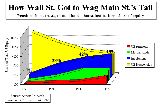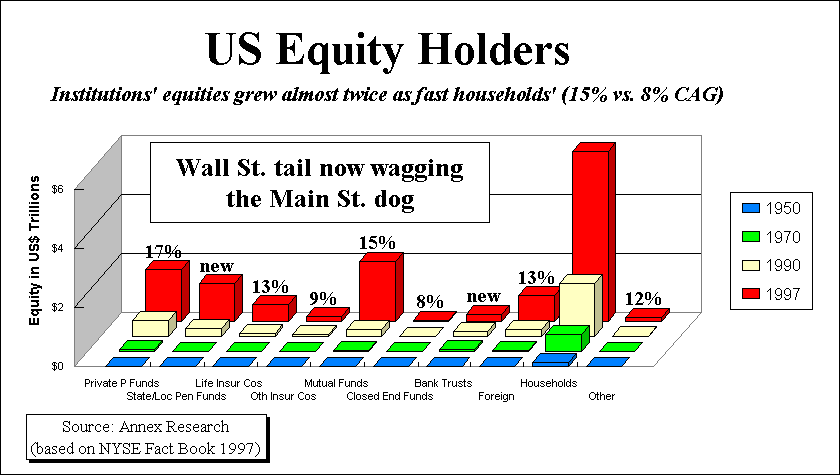 As a result, the Wall Street's institutional holdings have soared from a 7% share of the total U.S. equities in 1950, to 48% in 1997, according to the New York Stock Exchange Fact Book 1997. During the same time frame, the share of the stockmarket equity held by the U.S. households (i.e., the Main Street) declined from 90% to 44%, despite an 8% compound annual growth between 1950 and 1997.