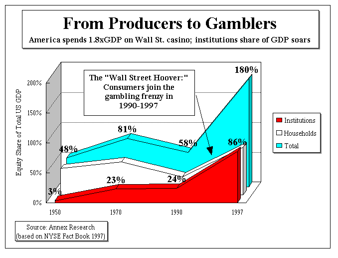 In other words, while some Main Street gamblers let the Wall Street Hoover suck about 8% more money out of their wallets or mattresses for the last 47 years, the institutions kept pumping into the market the equity capital at a 15% compound annual rate. The result was a loss of market power for the Main Street suckers, and a surge of it for the Wall Street elite. As in any casino, it takes a gambling sucker to enrich the "house" through his greed or gullibility. This trend was especially discernible in the 1990s, when both the institutions' and the households' equity shares of the U.S. GDP soared from 24% and 29% respectively in 1990, to 86% and 80% in 1997. As a result, the U.S. stockmarket equities broke the bank by the end of 1997, the Southeast Asia and Russian crises notwithstanding. They reached a record, $13 trillion level. Just to put things in perspective - that's 1.8 times the U.S. GDP. Back in 1950, their corresponding share was only 48% of the U.S. GDP, with the institutions accounting for a mere 3% of the U.S. GDP.