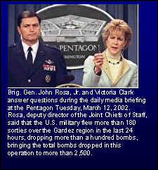 military reporting that we all witnessed almost three Only a lapdog media reporter or a brain-dead citizen would have believed Bill Clinton’s claim in June 1999. Only a lapdog reporter or a brain-dead citizen would buy the official Pentagon line today. Yet a poor performance of the American troops in the mountainous terrain of Eastern Afghanistan should surprise no one. Least of our Secretary of State, a former military man, who has evidently done a turn-about-face in his new job. “We don’t do mountains, we only do deserts,” a younger and wiser Gen. Colin Powell rebuffed Madeleine Albright, Clinton’s Secretary of State, back in 1994, when Powell was still the Chief of General Staff, and she was the U.S. ambassador at the U.N. (see “Mountains Ground U.S. Apaches,” S99-86, Day 60, May 22, 1999). Albright, whom this writer (among others) had dubbed “Madam Halfbright” long before she amply justified that epithet during the 1999 NATO bombing, chided Powell over his reticence to commit U.S. troops to Bosnia: “What good is having the world’s most powerful military if you don’t use it” (to weigh in on the side of the Bosnian Muslims and Croats and against the Serbs). The preceding was the extent of Madam Halfbright’s “military doctrine,” on the basis of which she would have sent the American troops into harms way. Eight years ago, Albright’s arrogant and ignorant attitude was shocking. Today, such attitudes are banal. They are the norm, not an exception, in today’s Washington. Eight years ago, Clinton’s New World Order hawks were silenced by a saner majority in our government. Today, the Bush league hawks roam, reign and rain terror freely. Now, the truth and the American people are silenced, not just the peace doves. Here’s a case in point. While the Washington brass was making its “Anaconda” “victory proclamations,” the public in Britain and France, for example, was able to get an entirely different picture of what actually went on in Eastern Afghanistan during the last two weeks. As you read the following excerpts from the European media, keep in mind that both the British and the French have their own troops deployed in Afghanistan. Which means their own military intelligence and their own war reporters. The only difference seems to be that their media aren’t as subservient to and gagged by the military. Here’s, for example, an excerpt from a Mar. 12 report by the London Times, filed from Afghanistan: 'Inadequate' US troops pulled out of battleground;War on terror CATHERINE