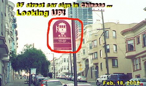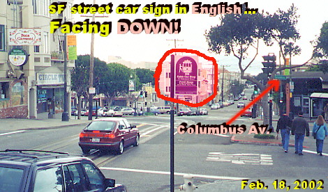 Cubin, N. Also see the House Immigration Borders Roll Call: http://www.washingtonpost.com/wp-dyn/articles/A16260-2002Mar12.html ------------- 4. Ups and Downs of Immigration, San Francisco Style Just before heading out of San Francisco for a beautiful coastline drive to Santa Cruz in mid-February, the TiM editor took these two photos at Mason Street's intersection with Columbus Avenue. Thought the street car sign visually reinforced the "Decline of the West" picture that Pat Buchanan paints in his latest book by that title. Ultimately, this may lead to another editorial on immigration, dovetailing on this writer's 1995-1996 pieces "When Cultures Collide" (WT column, 8/18/96), "Plutocrats of the New World Order" (WT, March 1997), "Toward Nations of Obedient Mutts" (Jan. 1999), and "A Demographic Earthquake Strikes California" (July 5, 2000). For now, however, the visual "ups and downs of immigration San Francisco style" should serve as an introduction. ------------- Also check out... Bush