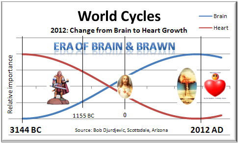 The above chart depicts qualitatively this writer's vision of the evolution of man from a touchy-feely, rough and tumble creature 5122 years ago; to a warrior who tried to dominate his fellow man by fear in the middle part of the era; to a "brainiac" capable of destroying the planet and life itself in the closing decades of the world cycle; as the "old man" relentlessly tried to exercise power over others. Luckily, that era is now drawing to a close. We may still have one last world war or a major regional conflict in 2010, according to Braden's fractal analysis. If so, it will be sort of the "last hurrah" of the "brain and brawn" world cycle, the dying gasp of the only remaining superpower. So the transition from one era to the next will be "brief but intense," as you saw earlier. Next World Cycle: "Era of the Heart"After that storm blows over, there is much to rejoice as humanity looks forward to 2012 and beyond. A new breed of man will emerge in the next world cycle, the "era of the heart." Unconditional Love will help reunite him/her with the Creator and the forces of the universe.