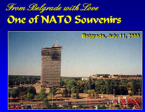 clerk added. "No problem," I said. "If a bomb hits the hotel, I don't think it will make much difference what floor I am on." Suddenly, I realized that some of that swagger went out of the staff's body language. It is one thing to sound brave and boisterous when the bombs are falling somewhere else in the city. But my comment seems to have struck home... that we could all also be targets here at the Intercontinental. (A few days later, the nearby Hotel Yugoslavia was hit, as was a tall office building very close to the Intercontinental Hotel - see a Belgrade "postcard," right - "One of NATO Souvenirs," taken a year later). 4.