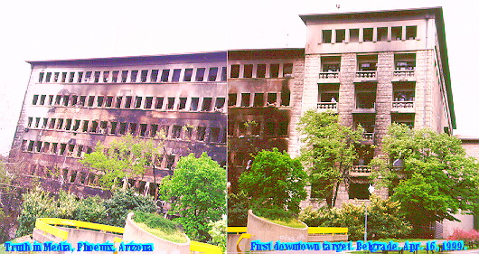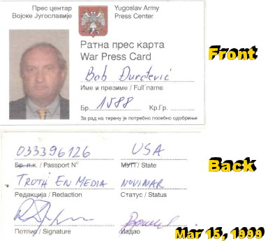 Interestingly, I felt no fear. Instead, I felt anger rising in me anew, watching my hometown burn. "Bastards," I thought, thinking of Clinton, Albright, Gen. Clark and other marionettes of the New World Order who were terrorizing innocent civilians like that, so they can play their geopolitical monopoly games. And then I wrote about it. And wrote about it. And millions of people around the world read the reports, as I subsequently found out from the number of hits the TiM web site was receiving. And then they got angry, too. And joined in to protest the war at rallies in Washington, DC, among others (see March on the Pentagon; June 6, 1999). The phone in my room rang. A strange male voice was on the line. "Is this Mr. Djurdjevic?" the caller asked. "And who wants to know?" I replied brusquely, always cognizant of spies spying on spies in situations like this. The caller introduced himself as General Such and Such of the Yugoslav Army. "How did you know I was here?" I asked. "Your sister told me. We knew that you were coming (I supposed from the UN and Budapest ambassadors), so we called your sister figuring she'd know how we could reach you." "And what can I do for you?" "Well, it's kind of hard to talk on the open lines like this one, but I wonder if you could meet with us tomorrow morning?" "What for? What do you want to talk about?" "As I said, I can't say on the phone. But we understand that there has been a meeting today in Washington between some Serbs and President Clinton and since you are an American with good connections, we thought you may be able to help us find out more about it." "Okay," I said. "I'll see what I can do." I then dialed a number in Washington, DC. Bingo. The person I talked to had just come back from that White House meeting. He told me all about it (see "Clinton Pleads to Serbian-Americans for Help", Apr 16, 1999). I called the Serbian general back and told him all I knew. He seemed shocked. "My God, you work fast!" he exclaimed. "That's incredible. We've been trying all day to find out what happened and kept striking out. And you did it in just a few minutes. But please don't say anything more on an open line. Can we meet in the morning? We'll send a car for you." Of course, I was going to "say things on an open line." That's what war correspondents do. Dig out the truth and report it. So I then went on to write up the above TiM Bulletin about Clinton pleading for help. So the meeting next morning was an anti-climax. But it was interesting to talk to the top two Yugoslav Army generals who were in charge of the country's military intelligence. So I sort of turned tables on them to get some more information about how the war was going. It seemed only fair. They seem to be grateful for the White House news I dug out and filled me in quite extensively about the deception tactics they were using. It was only years later that such information became public knowledge (see "How Serb Dummies Fooled NATO Dummies," June 1999, and "NATO's Secret Losses," Aug 2006). 5. Card-carrying War Correspondent Later in the day, I was picked up at the hotel by one