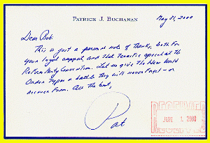 This is just a personal note of thanks, both for your loyal support, and that terrific speech at the Reform Party Convention. Let us give the New World Order types a battle they will never forget - or recover from. All the best,