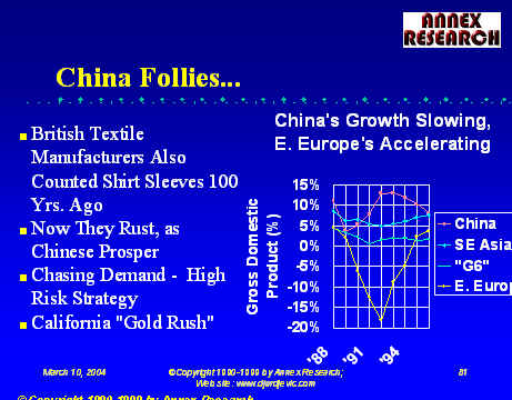 Almost 10 years ago, almost to the day, we first warned about the upcoming "China Follies".  The Annex Bulletin  "Mountain Shook, Mouse Was Born" (Mar 1994) actually dealt with the former IBM chairman and CEO's first "vision statement."  It was short on vision and long on follies: