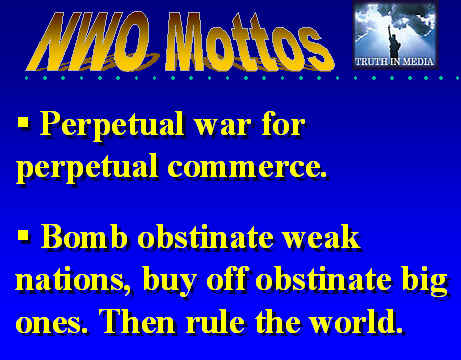 The fact that both Republican and Democratic administrations did it, proved that there is no substantial difference between the two.  Both are in service of the NWO globalists’ imperial agenda whose secret motto is, “perpetual commerce through perpetual war” (see “Stitching Together the NWO Flag”), not “worldwpe35.jpg (40845 bytes) peace through world trade,” its publicly proclaimed slogan.