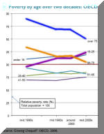 · The richest 10% of Americans earn an average of $93,000 (highest in the OECD). The poorest 10 percent of Americans earn an average of $5,800 (about 20 percent lower than the OECD average). · The rise in inequality is generally due to the rich improving their incomes relative both to low- and middle-income people. · Older people are much less likely to be poor than in the past. Poverty has shifted from pensioners to young adults and families with children (see chart below left). So sock