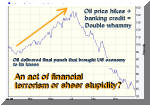 side their bread is buttered on and how to toe the line. Okay, so if it's not financial terrorism, what is it? Try sheer stupidity (left chart). Greed can be a blinding emotion that can cloud good judgment. That's evidently what happened in the oil industry last summer, when they put on a choke hold on a patient that was already struggling to get some oxygen. So the U.S. consumer found himself squeezed from two sides at the same t "The further erosion of the consumer confidence index reflects the rapid and steep deterioration of economic conditions that occurred in the fourth quarter of 2008," said Lynn Franco, director of the Conference Board's Consumer Research Center. "The overall economic outlook remains quite dismal for the first half of 2009, and only a modest recovery is expected in the second half." The recor On the other hand, the tightening of credit by the ailing banks caused the U.S. households' debt to declined for the first time in history, the Federal Reserve reported earlier this month (Dec 11). Stung by the loss of $2.81 trillion in their net wealth, people paid down their debts in the third quarter for the first time since at least 1952, since such records have been kept. But hold your horses. Put that champagne back on ice. Our shopaholic society can't be been cured so easily of a spending disease that took over half a century to develop. The U.S. central bank also reported that the debt taken on by the federal government soared by 39% to a postwar record. Which means the taxpayers are still stuck with the debt for all those banking and auto-industry bailouts. We'll just have to pay it through taxes rather than directly to the banks. Bleak Outlook Should Be Tempered Meanwhile, compounded negative economic pressures have already led to a