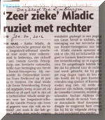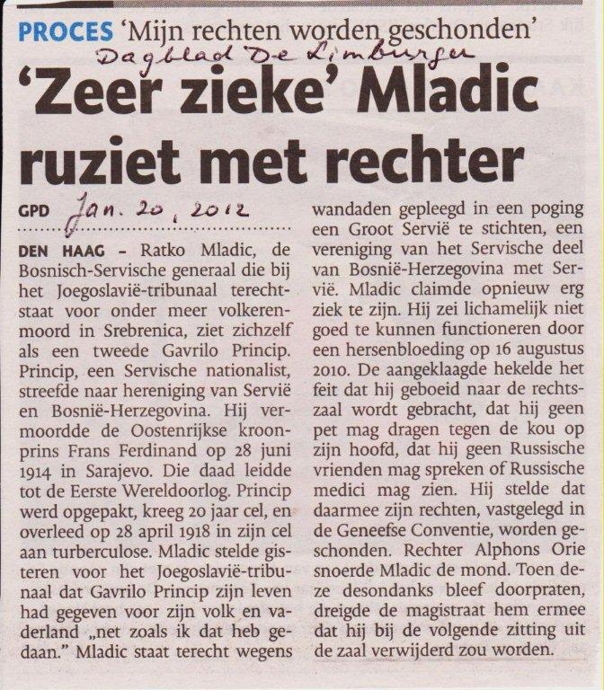 Mladic told Judge Orie that he had lost 20 kilos (over 40 pounds) while in prison. But the judge rejected his appeal for more medical tests, saying that he had been examined by doctors and his condition was seen as "good enough" to attend the preliminary hearing, according to a major Dutch newspaper report (see Mladic betuigt spijt om slachtoffers oorlog - in Dutch, we're afraid, thought we do have a rough translation - click on left photo to see a scanned story; also see Mladic Trial, by SENSE agency). The judge rejected any new medical examinations. Such a cavalier attitude by the court is nothing new at the Hague. A number of Serb defendants have died while incarcerated there. The most notorious of those was Serb President Milosevic who also complained about a lack of medical care he was (not) receiving for his heart condition. He died in 2006 (see Milosevic: Who Says There's No Death Penalty at the Hague?, Mar 2006, also see "Put the UN Justice on Trial" - TiM Bulletin, Aug 1998). Will Mladic be next? As for the trial of the other "star