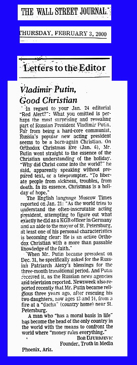 PHOENIX, ARIZONA An abridged version of this letter was published by the Wall Street Journal on Feb. 3, 2000 under the headline, "Vladimir Putin, Good Christian." Published paragraphs are highlighted.