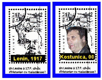 opposition to the work and legitimacy of the But that’s the good news. That’s the good news? Yes. So what’s the bad news then? It’s what Kostunica reportedly has said himself in a meeting on the same topic (the UN War Crimes Tribunal setting up shop in Belgrade) with the Austrian foreign minister, Mrs. Benita Ferrero-Waldner, who is also the head of the Vienna-based OSCE (Organization for Security and Cooperation in Europe). And what was that? He likened himself to Lenin. Kostunica, the Serb “nationalist,” the God-fearing Christian who won the backing of the Serbian Orthodox Church even before the Oct. 5 “revolution;” the “first non-communist president of Yugoslavia in over 50 years?” That Kostunica likened himself to Vladimir Ilich Lenin, the leader of the Communist Revolution in Russia? Well, that Kostunica has evidently passed away. But the one who talked to that Austrian lady on How do you know that? First, from a well-connected EU source in Brussels (who also provided to us a year ago the information about the EU issuing a news “Lenin Stamp in Belgium”,” Nov. 24, 1999). Second, from today’s (Nov. 6) Agence France Presse (French language) report that quoted Madam Ferrero-Waldner to that effect. Here is an excerpt from it: “The