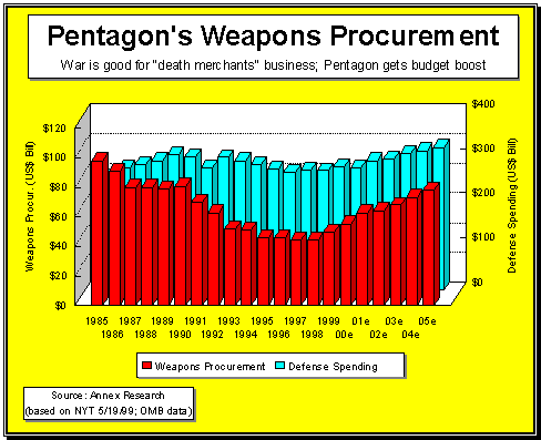 Russia and China also benefited from increased defense spending, each roughly doubling their weapons exports from the year before (Russia to $4.8 billion; China to $1.9 billion). U.S. arms sales were still below the peaks reached in the aftermath of the Persian Gulf war in 1991, but the United States has steadily increased its sales in the last few years, from $7.7 billion in 1997 and $10.3 billion in 1998, the report found. Furthermore, the Kosovo war and other U.S. military deployments, in which over 200,000 American soldiers are serving in various countries around the world, are likely to extend the U.S. “death merchants” bonanza this year, and over the next five to seven years. The Clinton-Gore administration has just seen to it, as the Pentagon received an unexpected $16 billion budget boost between 2002 and 2007, the Wall Street Journal reported on Aug. 23. With George W. Bush vowing to dramatically increase military spending, the American “death merchants” future seems very bright indeed no matter who wins in November. Wish one could say the same about the outlook for mankind.