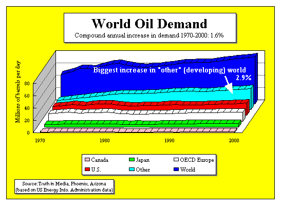Such an attitude by the Clinton-Gore administration is particularly hypocritical in view of the fact that OPEC has been boosting production, while the U.S. economy has not been throttling the demand for oil. During the 1995-2000 period, for example, the U.S. demand for oil went from 17.7 million barrels per day to 19.9 million barrels, a 12% jump, according to the EIA data. By contrast, OECD Europe’s demand rose by only 4.5% in the same period - from 14.1 million barrels to 14.8 million barrels, while Japan’s actually declined by 1% - from the 5.7 million barrels per day that this industrial country consumed in 1995. The demand in Canada, also increased in double digits, up 11% from 1995-2000, from 1.76 million barrels a day in 1995, to 1.96 million barrels this year. But the biggest increases in crude oil consumption during the last 30 years did not come from developed (OECD) countries. They occurred in the developing world (which includes countries such as China) that consumes 33.9 million barrels every day - roughly the same as the U.S. and OECD Europe - combined! In the last five years, that portion of the world oil demand also increased in double digits (up 11%), from 30.6 million barrels a day in 1995.