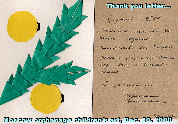 all year.” --- TiM Ed.: Upon Tanya’s arrival in the U.S. for the American Christmas holidays, she brought with her the thank you-letters by the director and the (unsigned) artwork by the children from that southwest Moscow orphanage. That’s how we are now able to share them with you, too.