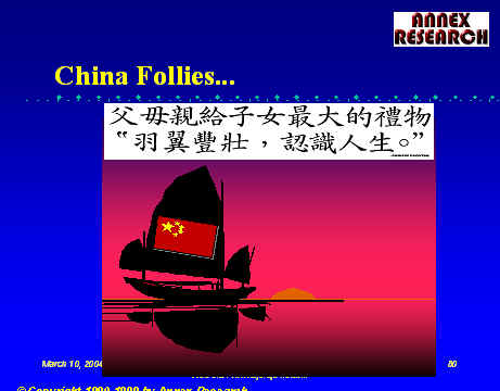 Almost 10 years ago, almost to the day, we first warned about the upcoming "China Follies".  The Annex Bulletin  "Mountain Shook, Mouse Was Born" (Mar 1994) actually dealt with the former IBM chairman and CEO's first "vision statement."  It was short on vision and long on follies: