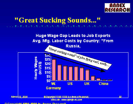 But don't get us wrong.  There is nothing wrong with fair competition, including that for jobs.  If the Chinese or the Indians are willing to work for wages 10 times lower than the Americans without either government's intervention, more power to them.  But there is plenty wrong with duping the population of the world's once most prosperous country into becoming the global bankers' stooges.  And that's what successive Washington administrations and the acquiescent Congress have been doing (honorable exceptions noted).