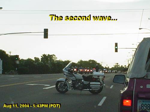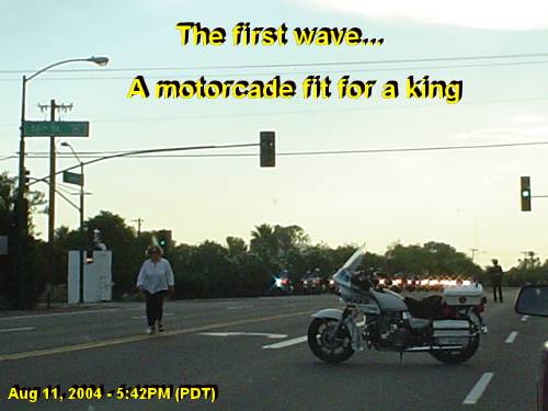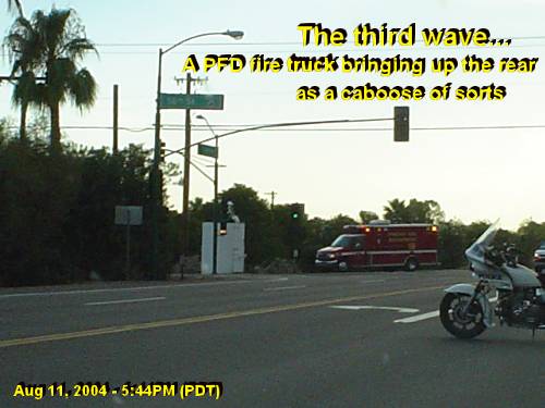 As you can see above, a fire truck brought up the rear of this long convoy of several hundred vehicles. Why would they need a fire truck as a presidential escort? I suspect the Secret Service's explanation would be something like "to assist in case of a crash or a bomb attack." But I could not help but chuckle... What if they were serving pretzels at the local fundraisers? Maybe the firemen were there to administer CPR in case His Majesty gets struck again by a case of pretzelitis? J (see “Enronizing Pretzelitis-” New Alzheimer Strain... Jan 17, 2002). Finally, at about 5:45PM, the cops let us through, heading westbound on Camelback Rd. As we drove by the Royal Palms, dozens of policemen and secret service agents were still around. The city of Phoenix must have deployed literally hundreds of cops, not to mention the federal agents, to escort His Majesty. Not even Tito, the penultimate emperor and the hated communist dictator in whose shadow I grew up, traveled with as much protection. Don’t you love the way we love our President? Isn’t it great the way he “mingles” with ordinary people? J P.S. Later on this evening, my wife was also detained trying to come home. His Majesty was evidently visiting some rich Phoenician in our neighborhood, as all of Arcadia was blocked off to traffic. Eventually, she made it home by circling the Camelback Mountain from the north. What is normally a five-minute drive, took nearly an hour! "One less reason to vote for him," I told her when she came home. J (Not that either of us would have voted for him anyway).