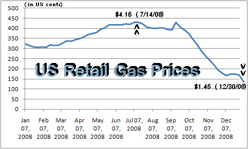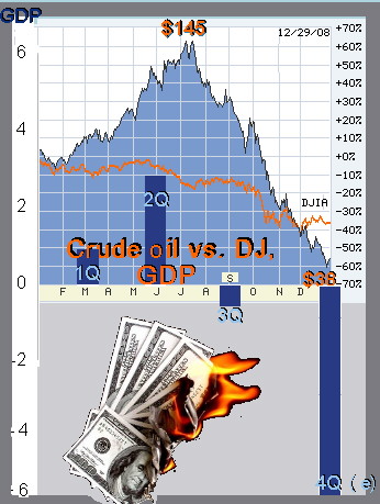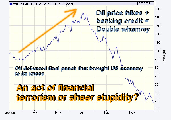 side their bread is buttered on and how to toe the line. Okay, so if it's not financial terrorism, what is it? Try sheer stupidity (left chart). Greed can be a blinding emotion that can cloud good judgment. That's evidently what happened in the oil industry last summer, when they put on a choke hold on a patient that was already struggling to get some oxygen. So the U.S. consumer found himself squeezed from two sides at the same t "The further erosion of the consumer confidence index reflects the rapid and steep deterioration of economic conditions that occurred in the fourth quarter of 2008," said Lynn Franco, director of the Conference Board's Consumer Research Center. "The overall economic outlook remains quite dismal for the first half of 2009, and only a modest recovery is expected in the second half." The recor On the other hand, the tightening of credit by the ailing banks caused the U.S. households' debt to declined for the first time in history, the Federal Reserve reported earlier this month (Dec 11). Stung by the loss of $2.81 trillion in their net wealth, people paid down their debts in the third quarter for the first time since at least 1952, since such records have been kept. But hold your horses. Put that champagne back on ice. Our shopaholic society can't be been cured so easily of a spending disease that took over half a century to develop. The U.S. central bank also reported that the debt taken on by the federal government soared by 39% to a postwar record. Which means the taxpayers are still stuck with the debt for all those banking and auto-industry bailouts. We'll just have to pay it through taxes rather than directly to the banks. Bleak Outlook Should Be Tempered Meanwhile, compounded negative economic pressures have already led to a