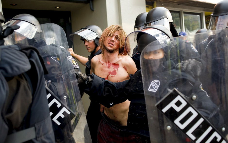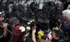 with the way the riot police handled some peaceful demonstrators at Queen