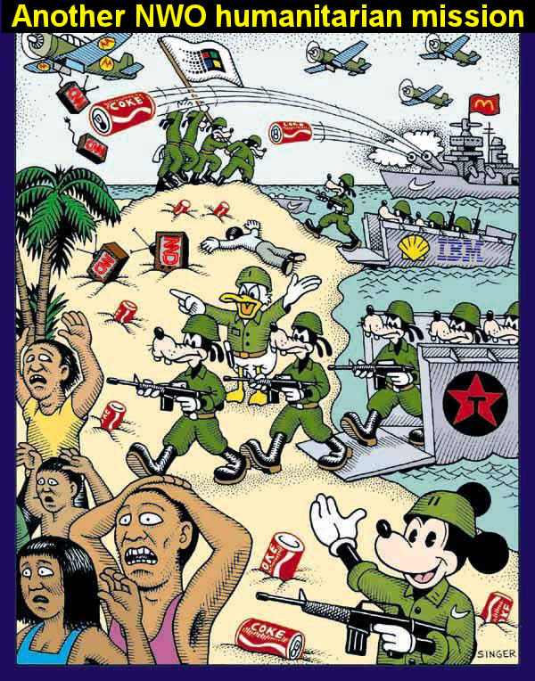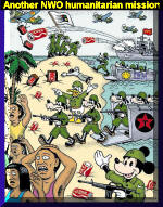 Perpe Since that time, we have been using the decade-long experience of a war correspondent for early detection of the next eruption of the NWO war volcano (Kosovo, Afghanistan, Iraq...). We are hearing those war drums again. As always, they are disguised as chirping of the doves of peace (see "Another NWO Humanitarian Mission"-cartoon - right). "Innocent sheep" in wolves' clothing start crying wolf while sharpening their knives for another attack. You know what they say about the difference between mechanical and civil engineers who work on NWO "humanitarian projects?" Mechanical engineers build the weapons. Civil engineers build the targets. :-) It is not hard to guess who the target will be. Iran, of course. The only question is when? Soon, would be our answer. What makes us so certain? Well, past experience, of course. "It's deja vu all over again," as Yogi Berra said. Slovenia, Croatia, Bosnia, Kosovo, Afghanistan, Iraq... The NWO has established a predictable pattern in the way it manufactures crises and wages war in order to quell them. Strike One: Mosque Near WTC in New York We first heard the drums of war in June. A friend from Canada sent a video and photo report about a protest in New York City against a planned building of a mosque near the World Trade Center. He dressed it up with some inflammatory comments about how the mainstream media were supposedly ignoring the news. Here's what we wrote to this friend in Canada contemporaneously, in early July: mosque/cultural center in that Fox News story. Are we to blame all Muslims, including these American citizens, for what foreign Islamic terrorists have done? If so, are we also going to hold all Christians responsible for the crimes committed during the Crusades or by the Nazis? (Don't forget that Hitler and Mussolini thought they were advancing a Christian cause and had full support of the Vatican). Intolerance is what led the pilgrims to leave England in pursuit of religious freedom. This country (America) is founded in part on guarantees of religious freedom. Of course, I understand the raw emotions of the families of the 9/11 victims as I do of those who oppose an individual's right to burn an American flag, for example. But once you start restricting people's freedoms, where do you stop? Hopefully before you wake up one day in a Nazi America run by white supremacists or Judeo-Christian zealots. For what it's worth... Thanks for this thought-provoking story. By now, of course, everybody can see how ludicrous that assertion was - that the media were supposedly ignoring this "controversy." Everybody and his uncle got into the act. Most normal people are sick and tired of hearing about it and seeing it in the news over and over again for almost three months now. Which is why you have not seen a comment from TiM until now. Strike Two: Burning of Koran Books in Florida A few days ago, the NWO drumbeat got louder.