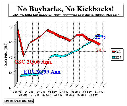 FROM WESTERN AUSTRALIA Topic: NORTH AMERICAN AFFAIRS WESTERN AUSTRALIA, Nov. 12 - Computer Sciences Corp. (CSC) is looking more and more like the Rodney Dangerfield of the IT services leaders. It's producing excellent business results but getting no respect on Wall Street. For the first six months of its FY00 (which ends March 31), for example, CSC's net earnings were up 22%. Its global commercial revenues rose by 21%, led by a 26% jump in U.S. commercial business. Fueled by the acquisition of the Singapore-based CSA Holdings, and a solid increase from CSC Australia, the company's Asia/Pacific revenues practically exploded, recording an 80% surge since a year ago. And even the U.S. government business increased modestly (2%), despite an expected drop (-3%) in the Department of Defense revenues (CSC is one of the Pentagon's top suppliers - see "Death Merchants'" View: "War Is Great; Peace Sucks; Long Live NATO!" - S99-83, Day 57, Item 1, May 19). This puts CSC on track to a $9 billion FY00 revenue total - a 22% compound annual growth in the 1990s. Yet, Wall Street basically shrugged off such a stellar performance. CSC's stock is down 1% since the day following its disclosure of the above results (Oct. 26). The reason? God only knows for sure when it comes to such a fickle being as the stockmarket. But there is at least one thing which sets CSC apart from its bigger rivals, such as IBM and EDS. CSC has stuck to its business fundamentals, instead of trying to get Wall Street kickbacks through stock buybacks. CSC's leaders seem to believe that substance will ultimately prevail over fluff (see our "fluff ratios" - market capitalization over equity). Which, of course, is an unwelcome tune on a Street of Fluff called Wall. If "the way to a man's heart is through his stomach," as an old Eastern European saw goes, then the equivalent Corporate America's truism nowadays seems to be "The way to higher share prices is through stock buybacks." No buybacks, no kickbacks (meaning Wall Street analysts' recommendations) - is clearly the message which today's perverted stockmarket keeps emitting, time and time again. Which, by the way, is not much different than the Old Continent truism. Stock buybacks may deplete the shareholders' cash, but they do put more food on Wall Street tables. Even twice(!), if the appeaser-courtier borrows money (from Wall Street, of course), to buy back its shares, such as EDS has done, for example (see Annex Bulletin 99-33, Oct. 30, 1999). Which is like taking out a mortgage on a house which you already fully own, and then bidding against yourself and other would-be buyers in the hope of raising the price. But fret not. Common sense was never high on the list of Eastern European lovers, either. For, there are still some "un-emancipated" women cooking delicious home made meals for their "politically incorrect" male lovers, rather than ordering out at some multinational fast food source of intestinal pollution - the recommended Wall Street alternative. No wonder, therefore, that Wall Street is punishing its disobedient subjects - like the good, old CSC, one of the most shining examples of how even big companies can reinvent themselves in a hurry (see the chart). Which only goes to prove that the Street of Fluff is no longer about business. Or excellence. It's an electronic casino for men and women in pin-striped suits, who treat blue chip companies, like CSC, the way blue collar gamblers handle the gambling chips at Las Vegas casinos. As disposables. Of course, you've heard us say that, or something like that, on a number of occasions