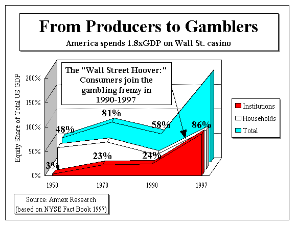 --- By now, we hope you're getting the message. The American society is being corrupted by an addiction worse than drugs. For, it impoverishes many more people, while creating an illusion of prosperity and feeling good. Just like drugs. Until the day of reckoning comes... Clinton's gambling Commission spent two years and $5 million of taxpayers dollars studying the $50 billion or so casino industry. But what about the $13 trillion Wall Street casino industry? What about the over 77 million adult Americans who participate in this form of legalized gambling, foolishly assuming that the odds are as "fair" as that in Las Vegas or Atlantic City? (see "Stock Buybacks: Corporate Cabbage Patch Dolls," TiM GW Bulletin 98/10-10, 10/31/98).