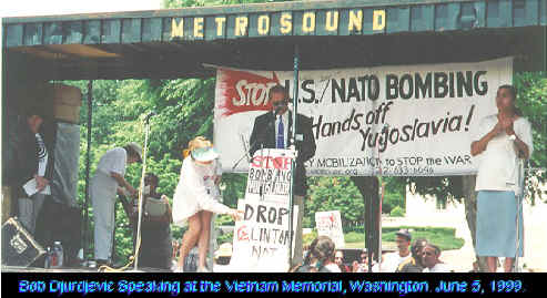 The stunning show of mass dissent was the first public demonstration against the government since the end of the last war. As this writer addressed his fellow-protesters (see Djurdjevic speaking at the Vietnam Memorial in Washington - above), he said in his speech: "I came to join you in your righteous protest against an American government which has become so un-American... This is a government... run by corrupt politicians, like Bill Clinton. And it is a government run against the interests of the American people." One tourist on the Memorial Bridge was offered a pamphlet explaining what the demonstration was about. He refused it, became very frightened, and sped away toward his hotel. And he wasn't even a foreign tourist. The date was June 5. The year was 1999. The nation's capital was Washington, DC. The