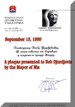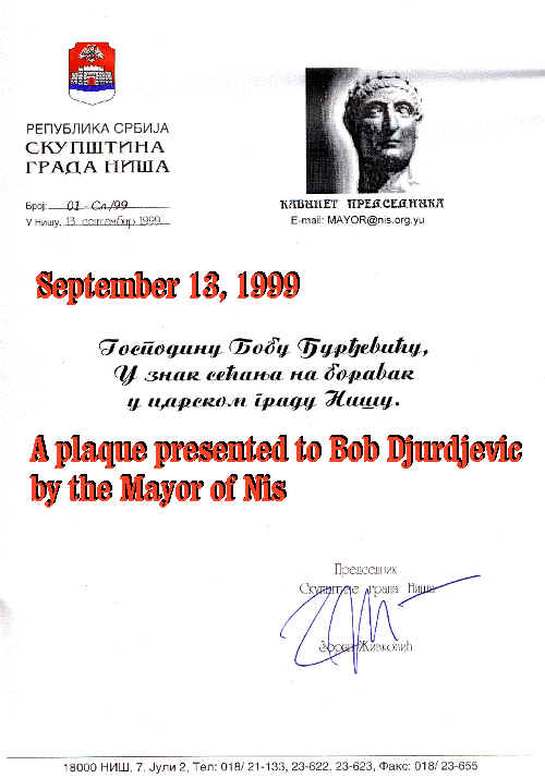 FROM WESTERN AUSTRALIA TiM's "TOUR DE SERBIA" - STAGE 2 - Sept. 13, 1999 Nis - Photo Album 2 (the afternoon) 1. Nis University building where the TiM editor gave his lecture on Sept. 13; 2. The TiM editor speaking at the Nis University Forum; 3. TiM editor and his wife at the Nis City Hall, with Mayor Zoran Zivkovic, plus the commemorative plaque presented by the Mayor to Bob Djurdjevic.